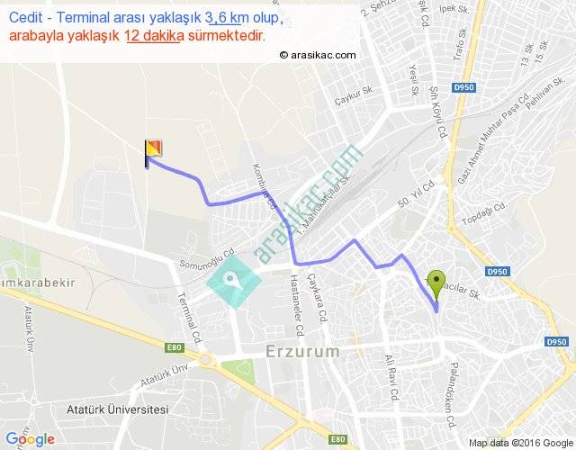 Cedit - Terminal arası yaklaşık olarak 90 km/h ile yukarıda belirtilen sürede olup, iki yerin kuş uçuşu uzaklığı (mesafesi) 3'dir. Yolculuk otobüsle 15 dakika sürmektedir.