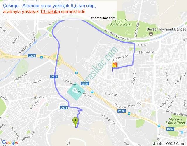 Çekirge - Alemdar arası yaklaşık olarak 90 km/h ile yukarıda belirtilen sürede olup, iki yerin kuş uçuşu uzaklığı (mesafesi) 2'dir. Yolculuk otobüsle 16 dakika sürmektedir.