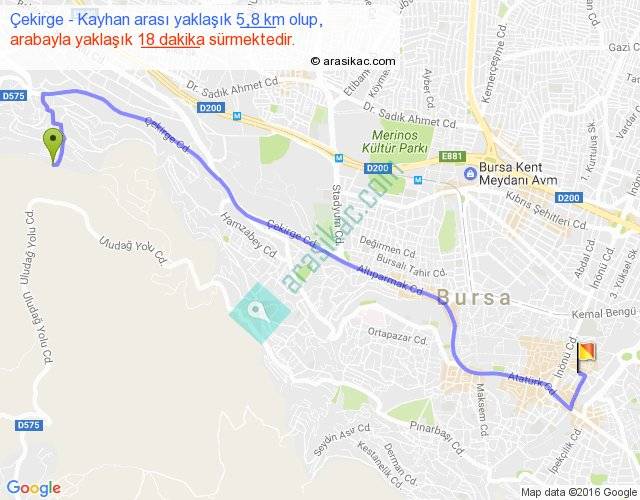 Çekirge - Kayhan arası yaklaşık olarak 90 km/h ile yukarıda belirtilen sürede olup, iki yerin kuş uçuşu uzaklığı (mesafesi) 4'dir. Yolculuk otobüsle 23 dakika sürmektedir.