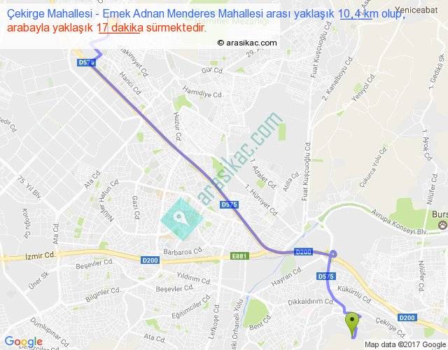 Çekirge Mahallesi - Emek Adnan Menderes Mahallesi arası yaklaşık olarak 90 km/h ile yukarıda belirtilen sürede olup, iki yerin kuş uçuşu uzaklığı (mesafesi) 8'dir. Yolculuk otobüsle 22 dakika sürmektedir.