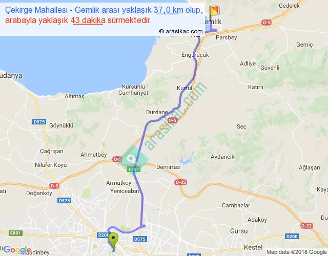 Çekirge Mahallesi - Gemlik arası yaklaşık olarak 90 km/h ile yukarıda belirtilen sürede olup, iki yerin kuş uçuşu uzaklığı (mesafesi) 28'dir. Yolculuk otobüsle 55 dakika sürmektedir.