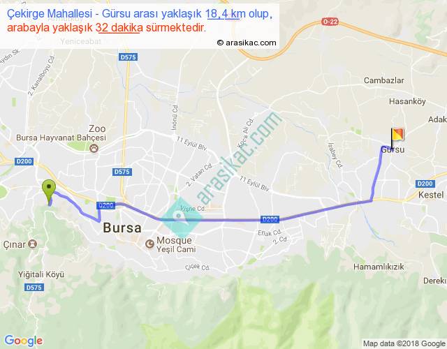 Çekirge Mahallesi - Gürsu arası yaklaşık olarak 90 km/h ile yukarıda belirtilen sürede olup, iki yerin kuş uçuşu uzaklığı (mesafesi) 14'dir. Yolculuk otobüsle 41 dakika sürmektedir.