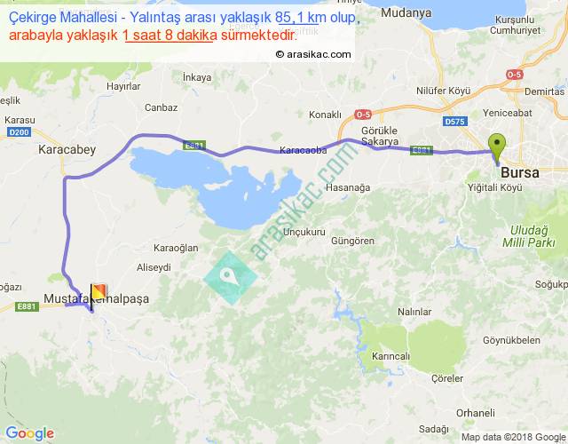 Çekirge Mahallesi - Yalıntaş arası yaklaşık olarak 90 km/h ile yukarıda belirtilen sürede olup, iki yerin kuş uçuşu uzaklığı (mesafesi) 56'dir. Yolculuk otobüsle 1 saat 28 dakika sürmektedir.