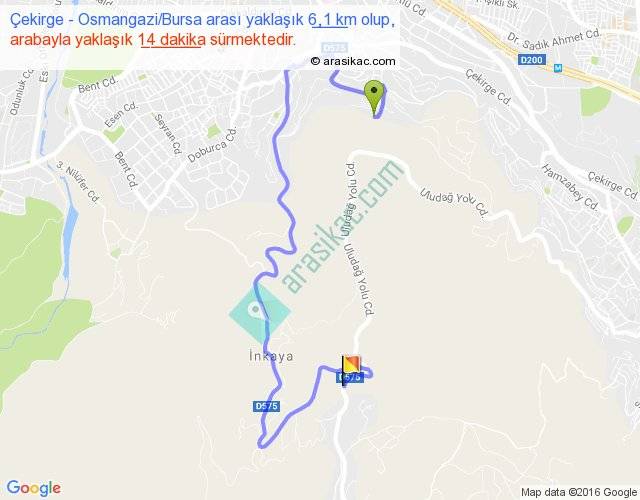 Çekirge - Osmangazi Bursa arası yaklaşık olarak 90 km/h ile yukarıda belirtilen sürede olup, iki yerin kuş uçuşu uzaklığı (mesafesi) 2'dir. Yolculuk otobüsle 18 dakika sürmektedir.