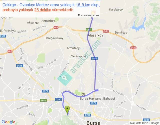 Çekirge - Ovaakça Merkez arası yaklaşık olarak 90 km/h ile yukarıda belirtilen sürede olup, iki yerin kuş uçuşu uzaklığı (mesafesi) 12'dir. Yolculuk otobüsle 32 dakika sürmektedir.