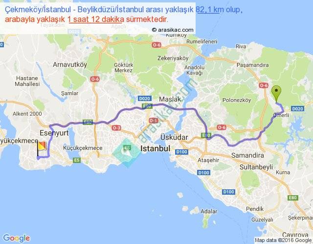 Çekmeköy İstanbul - Beylikdüzü İstanbul arası yaklaşık olarak 90 km/h ile yukarıda belirtilen sürede olup, iki yerin kuş uçuşu uzaklığı (mesafesi) 57'dir. Yolculuk otobüsle 1 saat 33 dakika sürmektedir.