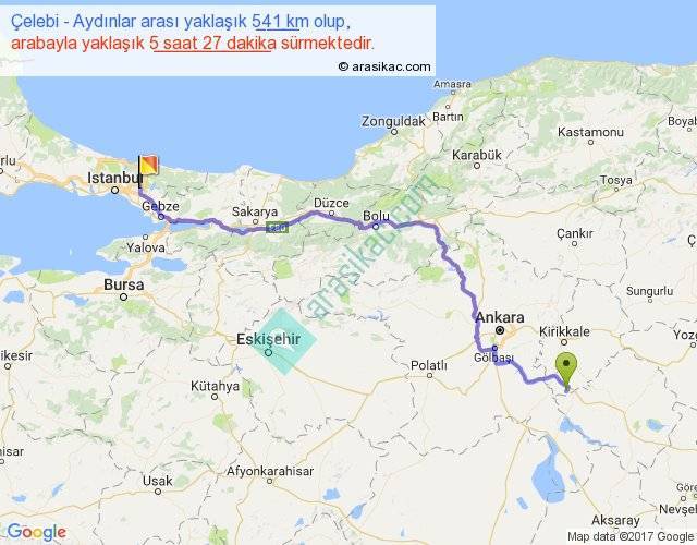 Çelebi - Aydınlar arası yaklaşık olarak 90 km/h ile yukarıda belirtilen sürede olup, iki yerin kuş uçuşu uzaklığı (mesafesi) 401'dir. Eğer belirtilen yerler arasında uçak seferi var ise bu süre uçakla 37 dakika'ya kadar düşebilir. Yolculuk otobüsle 7 saat 5 dakika sürmektedir.