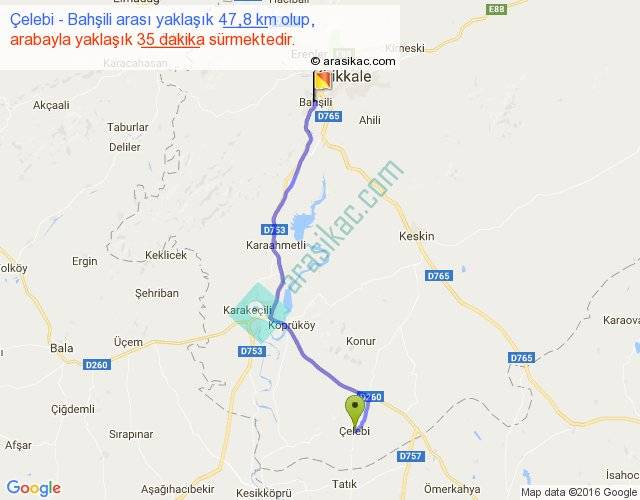 Çelebi - Bahşili arası yaklaşık olarak 90 km/h ile yukarıda belirtilen sürede olup, iki yerin kuş uçuşu uzaklığı (mesafesi) 39'dir. Yolculuk otobüsle 45 dakika sürmektedir.