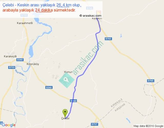 Çelebi - Keskin arası yaklaşık olarak 90 km/h ile yukarıda belirtilen sürede olup, iki yerin kuş uçuşu uzaklığı (mesafesi) 24'dir. Yolculuk otobüsle 31 dakika sürmektedir.