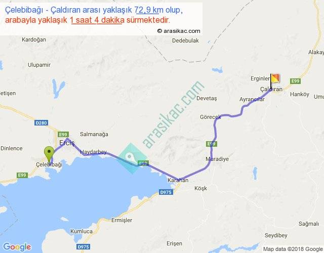 Çelebibağı - Çaldıran arası yaklaşık olarak 90 km/h ile yukarıda belirtilen sürede olup, iki yerin kuş uçuşu uzaklığı (mesafesi) 55'dir. Yolculuk otobüsle 1 saat 23 dakika sürmektedir.