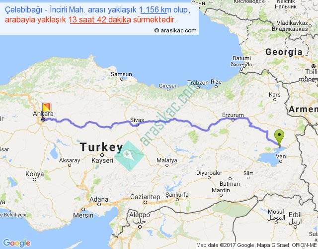 Çelebibağı - İncirli Mah. arası yaklaşık olarak 90 km/h ile yukarıda belirtilen sürede olup, iki yerin kuş uçuşu uzaklığı (mesafesi) 899'dir. Eğer belirtilen yerler arasında uçak seferi var ise bu süre uçakla 1 saat 22 dakika'ya kadar düşebilir. Yolculuk otobüsle 17 saat 48 dakika sürmektedir.