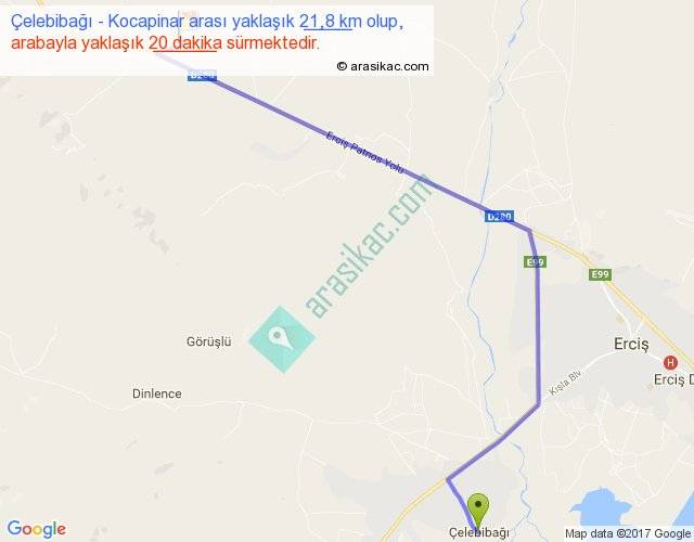 Çelebibağı - Kocapinar arası yaklaşık olarak 90 km/h ile yukarıda belirtilen sürede olup, iki yerin kuş uçuşu uzaklığı (mesafesi) 16'dir. Yolculuk otobüsle 26 dakika sürmektedir.