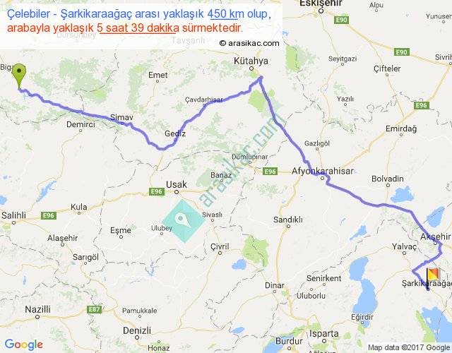 Çelebiler - Şarkikaraağaç arası yaklaşık olarak 90 km/h ile yukarıda belirtilen sürede olup, iki yerin kuş uçuşu uzaklığı (mesafesi) 306'dir. Eğer belirtilen yerler arasında uçak seferi var ise bu süre uçakla 28 dakika'ya kadar düşebilir. Yolculuk otobüsle 7 saat 20 dakika sürmektedir.