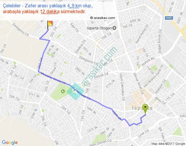Çelebiler - Zafer arası yaklaşık olarak 90 km/h ile yukarıda belirtilen sürede olup, iki yerin kuş uçuşu uzaklığı (mesafesi) 3'dir. Yolculuk otobüsle 15 dakika sürmektedir.