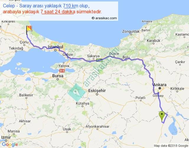 Celep - Saray arası yaklaşık olarak 90 km/h ile yukarıda belirtilen sürede olup, iki yerin kuş uçuşu uzaklığı (mesafesi) 503'dir. Eğer belirtilen yerler arasında uçak seferi var ise bu süre uçakla 46 dakika'ya kadar düşebilir. Yolculuk otobüsle 9 saat 37 dakika sürmektedir.