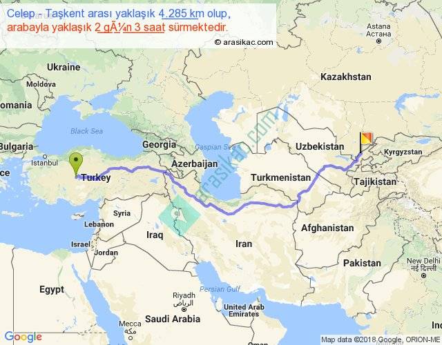 Celep - Taşkent arası yaklaşık olarak 90 km/h ile yukarıda belirtilen sürede olup, iki yerin kuş uçuşu uzaklığı (mesafesi) 3057'dir. Eğer belirtilen yerler arasında uçak seferi var ise bu süre uçakla 4 saat 42 dakika'ya kadar düşebilir. Yolculuk otobüsle 2 gün 18 saat sürmektedir.