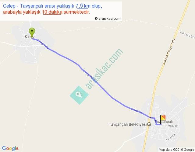 Celep - Tavşançalı arası yaklaşık olarak 90 km/h ile yukarıda belirtilen sürede olup, iki yerin kuş uçuşu uzaklığı (mesafesi) 8'dir. Yolculuk otobüsle 13 dakika sürmektedir.