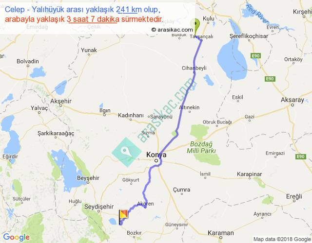 Celep - Yalıhüyük arası yaklaşık olarak 90 km/h ile yukarıda belirtilen sürede olup, iki yerin kuş uçuşu uzaklığı (mesafesi) 199'dir. Yolculuk otobüsle 4 saat 3 dakika sürmektedir.