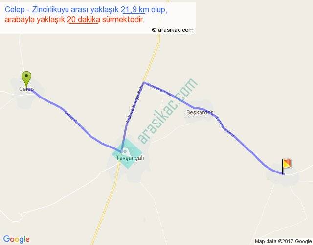 Celep - Zincirlikuyu arası yaklaşık olarak 90 km/h ile yukarıda belirtilen sürede olup, iki yerin kuş uçuşu uzaklığı (mesafesi) 16'dir. Yolculuk otobüsle 26 dakika sürmektedir.