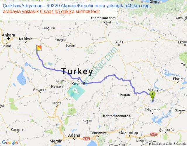 Çelikhan Adıyaman - 40320 Akpınar Kırşehir arası yaklaşık olarak 90 km/h ile yukarıda belirtilen sürede olup, iki yerin kuş uçuşu uzaklığı (mesafesi) 405'dir. Eğer belirtilen yerler arasında uçak seferi var ise bu süre uçakla 37 dakika'ya kadar düşebilir. Yolculuk otobüsle 8 saat 46 dakika sürmektedir.