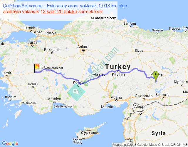 Çelikhan Adıyaman - Eskisaray arası yaklaşık olarak 90 km/h ile yukarıda belirtilen sürede olup, iki yerin kuş uçuşu uzaklığı (mesafesi) 786'dir. Eğer belirtilen yerler arasında uçak seferi var ise bu süre uçakla 1 saat 12 dakika'ya kadar düşebilir. Yolculuk otobüsle 16 saat 2 dakika sürmektedir.