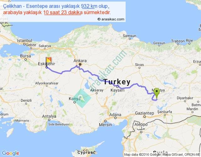 Çelikhan - Esentepe arası yaklaşık olarak 90 km/h ile yukarıda belirtilen sürede olup, iki yerin kuş uçuşu uzaklığı (mesafesi) 692'dir. Eğer belirtilen yerler arasında uçak seferi var ise bu süre uçakla 1 saat 03 dakika'ya kadar düşebilir. Yolculuk otobüsle 13 saat 29 dakika sürmektedir.