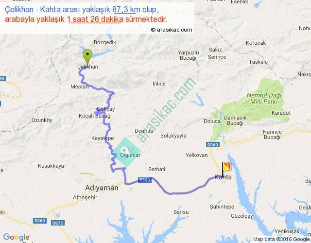 Çelikhan - Kahta arası yaklaşık olarak 90 km/h ile yukarıda belirtilen sürede olup, iki yerin kuş uçuşu uzaklığı (mesafesi) 43'dir. Yolculuk otobüsle 1 saat 51 dakika sürmektedir.