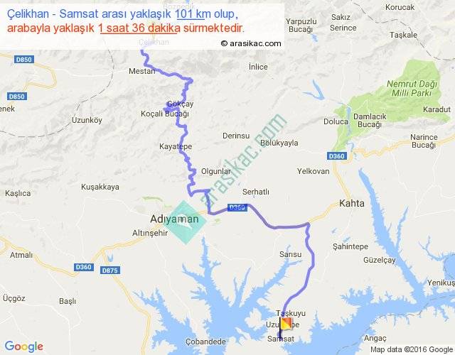 Çelikhan - Samsat arası yaklaşık olarak 90 km/h ile yukarıda belirtilen sürede olup, iki yerin kuş uçuşu uzaklığı (mesafesi) 55'dir. Yolculuk otobüsle 2 saat 4 dakika sürmektedir.