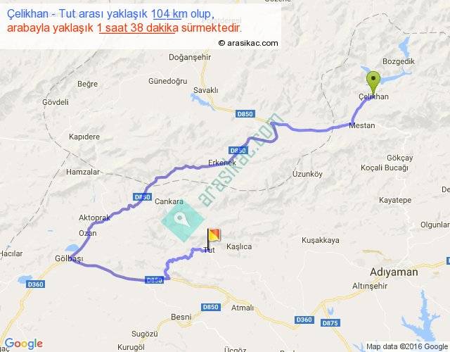 Çelikhan - Tut arası yaklaşık olarak 90 km/h ile yukarıda belirtilen sürede olup, iki yerin kuş uçuşu uzaklığı (mesafesi) 38'dir. Yolculuk otobüsle 2 saat 7 dakika sürmektedir.