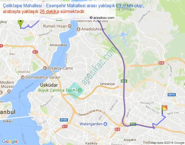 Çeliktepe Mahallesi - Esenşehir Mahallesi arası yaklaşık olarak 90 km/h ile yukarıda belirtilen sürede olup, iki yerin kuş uçuşu uzaklığı (mesafesi) 16'dir. Yolculuk otobüsle 33 dakika sürmektedir.
