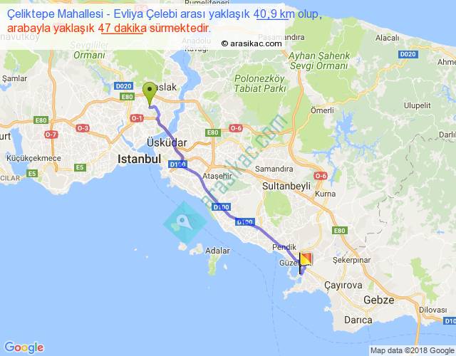 Çeliktepe Mahallesi - Evliya Çelebi arası yaklaşık olarak 90 km/h ile yukarıda belirtilen sürede olup, iki yerin kuş uçuşu uzaklığı (mesafesi) 36'dir. Yolculuk otobüsle 1 saat 1 dakika sürmektedir.