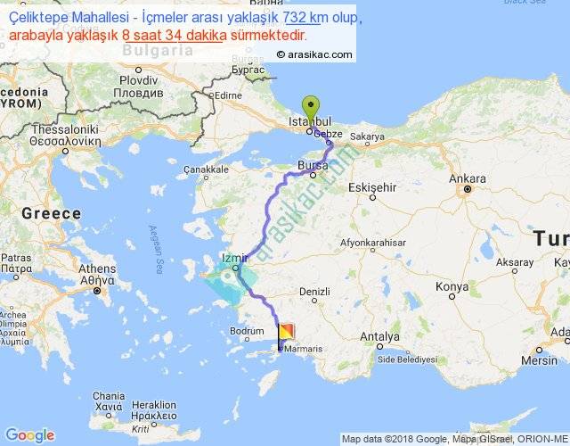 Çeliktepe Mahallesi - İçmeler arası yaklaşık olarak 90 km/h ile yukarıda belirtilen sürede olup, iki yerin kuş uçuşu uzaklığı (mesafesi) 478'dir. Eğer belirtilen yerler arasında uçak seferi var ise bu süre uçakla 44 dakika'ya kadar düşebilir. Yolculuk otobüsle 11 saat 8 dakika sürmektedir.