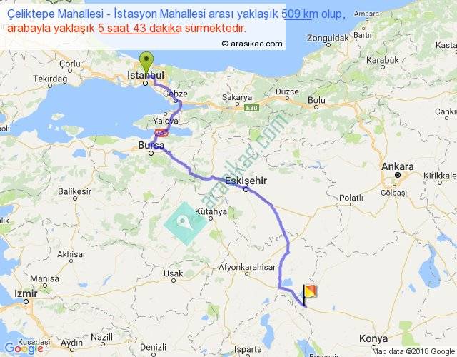Çeliktepe Mahallesi - İstasyon Mahallesi arası yaklaşık olarak 90 km/h ile yukarıda belirtilen sürede olup, iki yerin kuş uçuşu uzaklığı (mesafesi) 365'dir. Eğer belirtilen yerler arasında uçak seferi var ise bu süre uçakla 33 dakika'ya kadar düşebilir. Yolculuk otobüsle 7 saat 25 dakika sürmektedir.