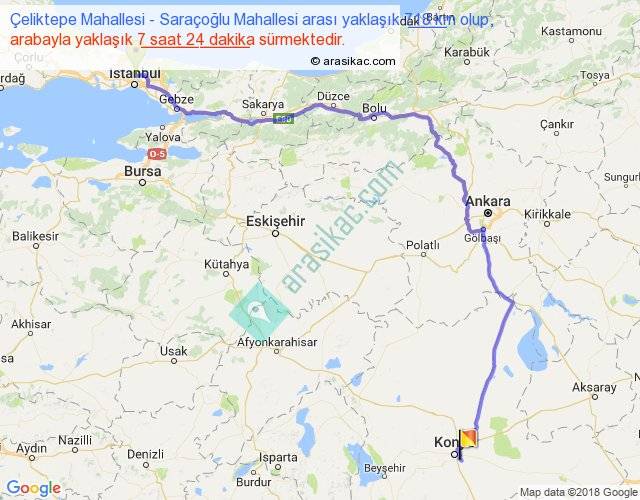 Çeliktepe Mahallesi - Saraçoğlu Mahallesi arası yaklaşık olarak 90 km/h ile yukarıda belirtilen sürede olup, iki yerin kuş uçuşu uzaklığı (mesafesi) 472'dir. Eğer belirtilen yerler arasında uçak seferi var ise bu süre uçakla 43 dakika'ya kadar düşebilir. Yolculuk otobüsle 9 saat 37 dakika sürmektedir.