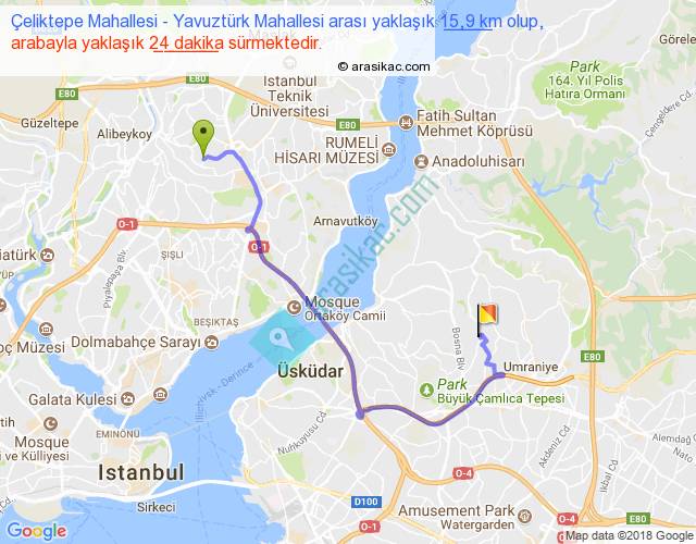 Çeliktepe Mahallesi - Yavuztürk Mahallesi arası yaklaşık olarak 90 km/h ile yukarıda belirtilen sürede olup, iki yerin kuş uçuşu uzaklığı (mesafesi) 9'dir. Yolculuk otobüsle 31 dakika sürmektedir.