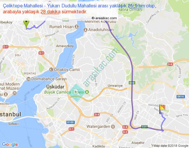 Çeliktepe Mahallesi - Yukarı Dudullu Mahallesi arası yaklaşık olarak 90 km/h ile yukarıda belirtilen sürede olup, iki yerin kuş uçuşu uzaklığı (mesafesi) 15'dir. Yolculuk otobüsle 36 dakika sürmektedir.