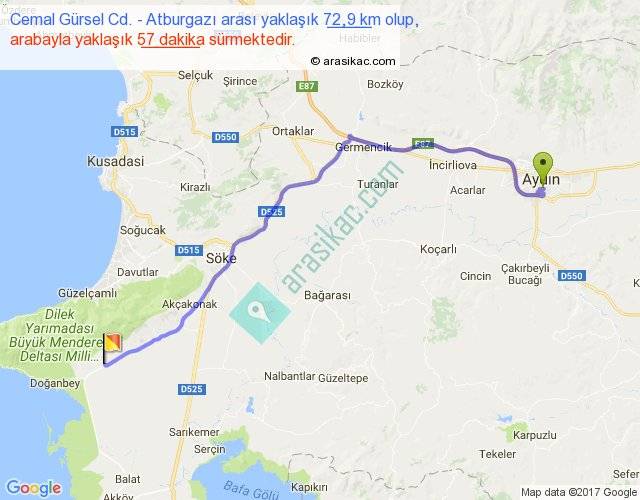 Cemal Gürsel Cd. - Atburgazı arası yaklaşık olarak 90 km/h ile yukarıda belirtilen sürede olup, iki yerin kuş uçuşu uzaklığı (mesafesi) 57'dir. Yolculuk otobüsle 1 saat 14 dakika sürmektedir.