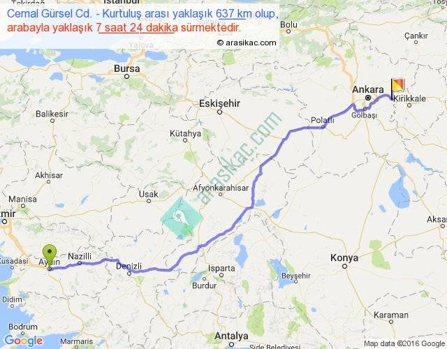 Cemal Gürsel Cd. - Kurtuluş arası yaklaşık olarak 90 km/h ile yukarıda belirtilen sürede olup, iki yerin kuş uçuşu uzaklığı (mesafesi) 518'dir. Eğer belirtilen yerler arasında uçak seferi var ise bu süre uçakla 47 dakika'ya kadar düşebilir. Yolculuk otobüsle 9 saat 37 dakika sürmektedir.