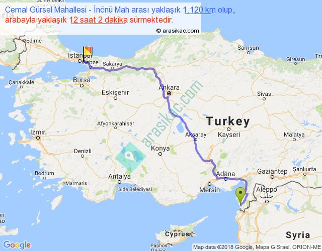 Cemal Gürsel Mahallesi - İnönü Mah arası yaklaşık olarak 90 km/h ile yukarıda belirtilen sürede olup, iki yerin kuş uçuşu uzaklığı (mesafesi) 802'dir. Eğer belirtilen yerler arasında uçak seferi var ise bu süre uçakla 1 saat 14 dakika'ya kadar düşebilir. Yolculuk otobüsle 15 saat 38 dakika sürmektedir.