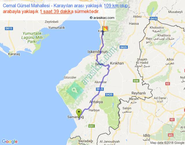 Cemal Gürsel Mahallesi - Karayılan arası yaklaşık olarak 90 km/h ile yukarıda belirtilen sürede olup, iki yerin kuş uçuşu uzaklığı (mesafesi) 74'dir. Yolculuk otobüsle 2 saat 8 dakika sürmektedir.