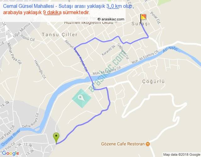 Cemal Gürsel Mahallesi - Sutaşı arası yaklaşık olarak 90 km/h ile yukarıda belirtilen sürede olup, iki yerin kuş uçuşu uzaklığı (mesafesi) 2'dir. Yolculuk otobüsle 11 dakika sürmektedir.