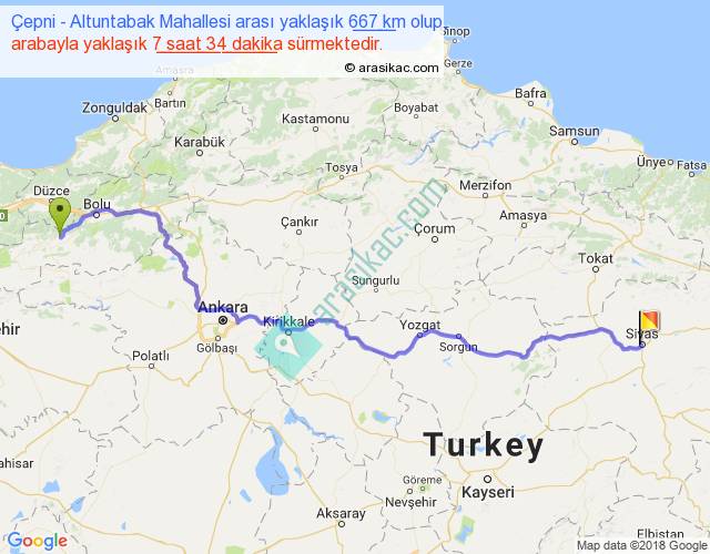 Çepni - Altuntabak Mahallesi arası yaklaşık olarak 90 km/h ile yukarıda belirtilen sürede olup, iki yerin kuş uçuşu uzaklığı (mesafesi) 494'dir. Eğer belirtilen yerler arasında uçak seferi var ise bu süre uçakla 45 dakika'ya kadar düşebilir. Yolculuk otobüsle 9 saat 50 dakika sürmektedir.