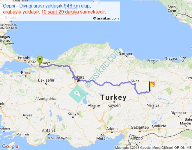 Çepni - Divriği arası yaklaşık olarak 90 km/h ile yukarıda belirtilen sürede olup, iki yerin kuş uçuşu uzaklığı (mesafesi) 698'dir. Eğer belirtilen yerler arasında uçak seferi var ise bu süre uçakla 1 saat 04 dakika'ya kadar düşebilir. Yolculuk otobüsle 13 saat 37 dakika sürmektedir.