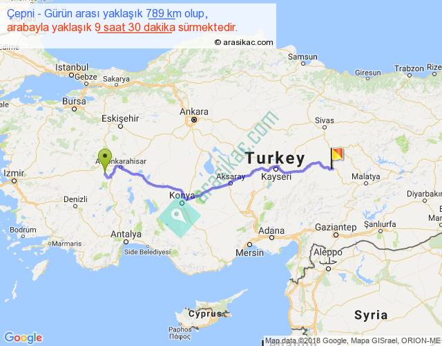 Çepni - Gürün arası yaklaşık olarak 90 km/h ile yukarıda belirtilen sürede olup, iki yerin kuş uçuşu uzaklığı (mesafesi) 625'dir. Eğer belirtilen yerler arasında uçak seferi var ise bu süre uçakla 57 dakika'ya kadar düşebilir. Yolculuk otobüsle 12 saat 21 dakika sürmektedir.