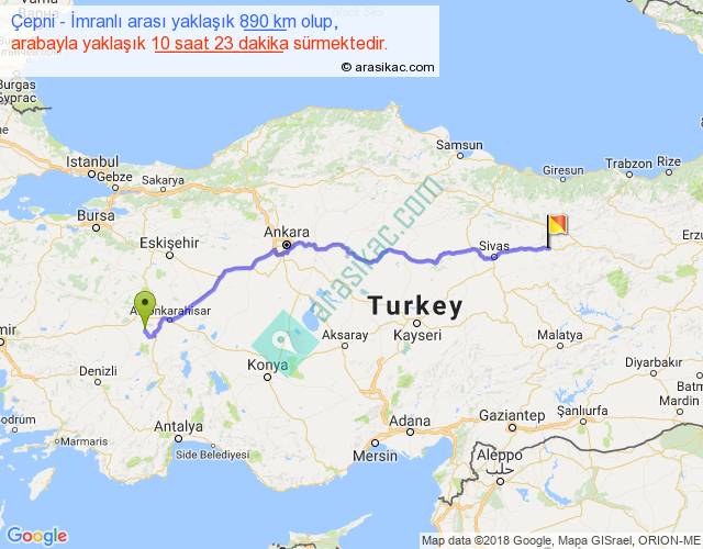 Çepni - İmranlı arası yaklaşık olarak 90 km/h ile yukarıda belirtilen sürede olup, iki yerin kuş uçuşu uzaklığı (mesafesi) 706'dir. Eğer belirtilen yerler arasında uçak seferi var ise bu süre uçakla 1 saat 05 dakika'ya kadar düşebilir. Yolculuk otobüsle 13 saat 29 dakika sürmektedir.