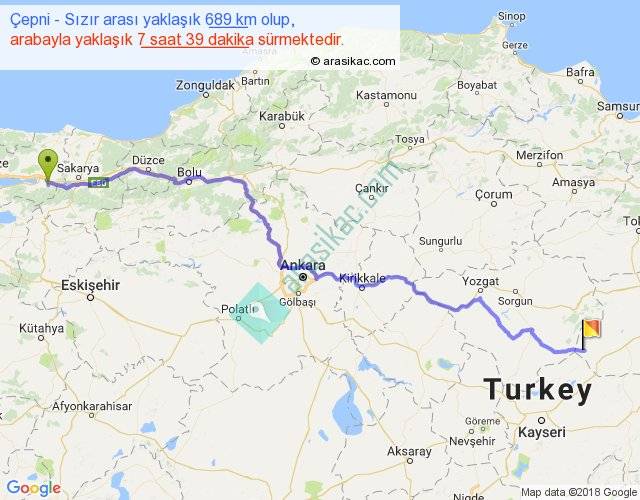 Çepni - Sızır arası yaklaşık olarak 90 km/h ile yukarıda belirtilen sürede olup, iki yerin kuş uçuşu uzaklığı (mesafesi) 522'dir. Eğer belirtilen yerler arasında uçak seferi var ise bu süre uçakla 48 dakika'ya kadar düşebilir. Yolculuk otobüsle 9 saat 56 dakika sürmektedir.