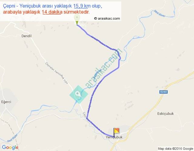 Çepni - Yeniçubuk arası yaklaşık olarak 90 km/h ile yukarıda belirtilen sürede olup, iki yerin kuş uçuşu uzaklığı (mesafesi) 11'dir. Yolculuk otobüsle 18 dakika sürmektedir.