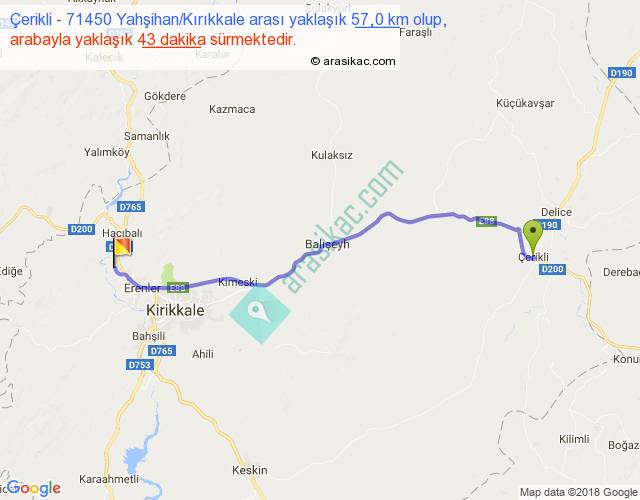 Çerikli - 71450 Yahşihan Kırıkkale arası yaklaşık olarak 90 km/h ile yukarıda belirtilen sürede olup, iki yerin kuş uçuşu uzaklığı (mesafesi) 49'dir. Yolculuk otobüsle 55 dakika sürmektedir.