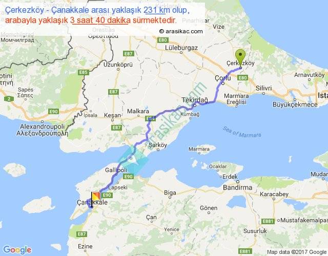 Çerkezköy - Çanakkale arası yaklaşık olarak 90 km/h ile yukarıda belirtilen sürede olup, iki yerin kuş uçuşu uzaklığı (mesafesi) 183'dir. Yolculuk otobüsle 4 saat 46 dakika sürmektedir.