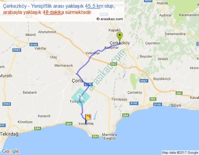 Çerkezköy - Yeniçiftlik arası yaklaşık olarak 90 km/h ile yukarıda belirtilen sürede olup, iki yerin kuş uçuşu uzaklığı (mesafesi) 32'dir. Yolculuk otobüsle 1 saat 2 dakika sürmektedir.